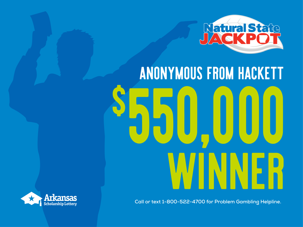 A Hackett resident won $550,000 in the Nov. 4 Natural State Jackpot (NSJ) drawing and claimed his prize at the Arkansas Scholarship Lottery (ASL) Claim Center on Nov. 7. The winning numbers were 10, 17, 18, 26 and 27.