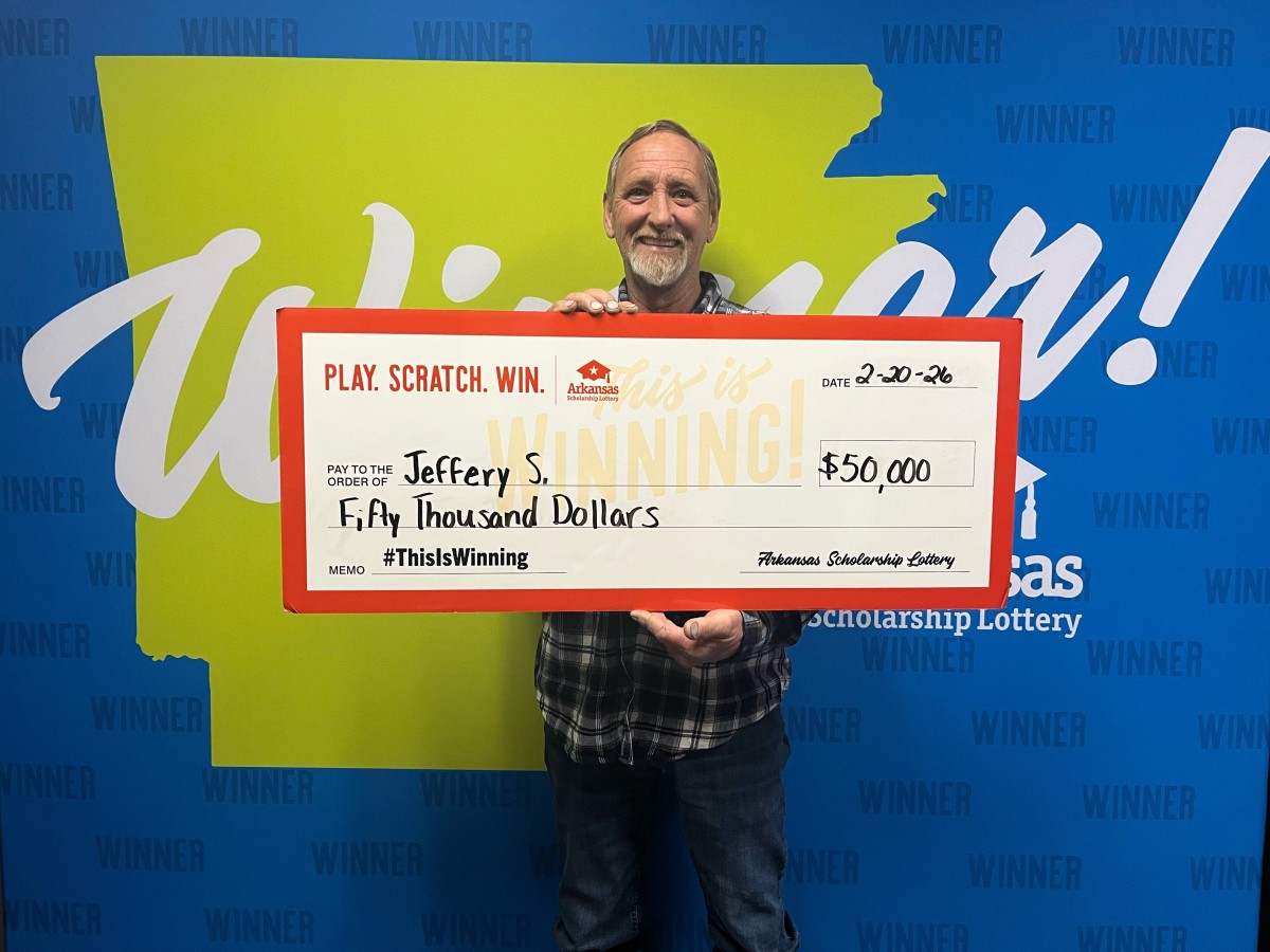 Lewisville resident Jeffery S. won $50,000 playing $50,000 Stacked, a $20 instant game. He claimed his prize at the Arkansas Scholarship Lottery Claim Center on Feb. 20.