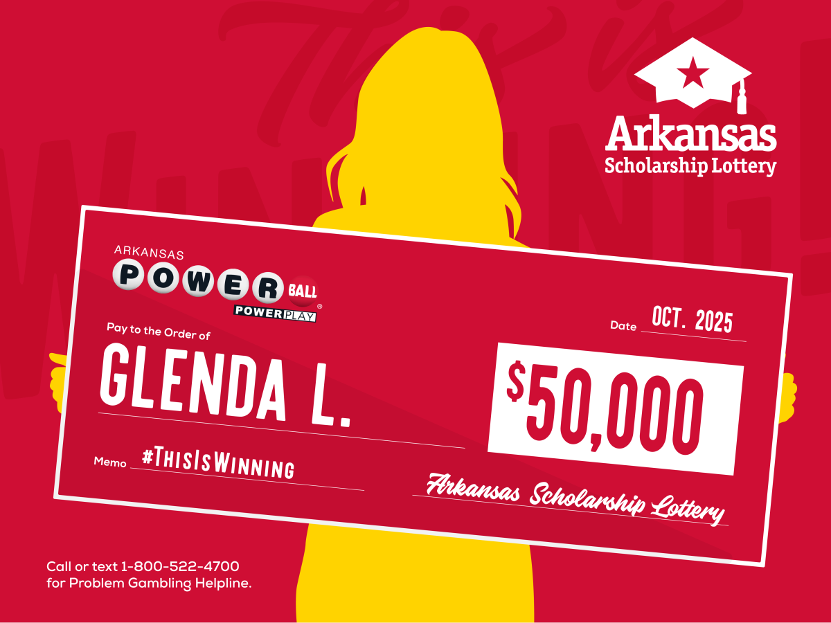 Glenda L. from Madison County won $50,000 in the Oct. 13 Powerball® drawing. She claimed her prize at the Arkansas Scholarship Lottery Claim Center on Oct. 20.