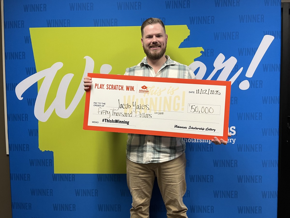 Jacob Yates of Craighead County won $50,000 playing $50,000 Frenzy, a $20 instant game. He claimed his prize at the Arkansas Scholarship Lottery Claim Center on Nov. 12.